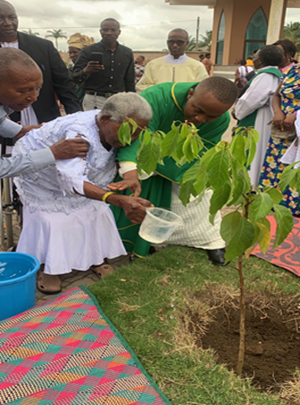 Une personne âgée de 105 ans plante un arbre commémoratif à l'occasion de la Journée des personnes âgées le 23 juillet 2023 dans l'une des paroisses de Dar es Salaam. |